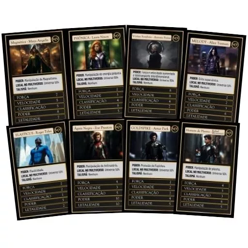 Cards colecionáveis exclusivos de 8 personagens com habilidades, nível de força, velocidade e letalidade de cada um.